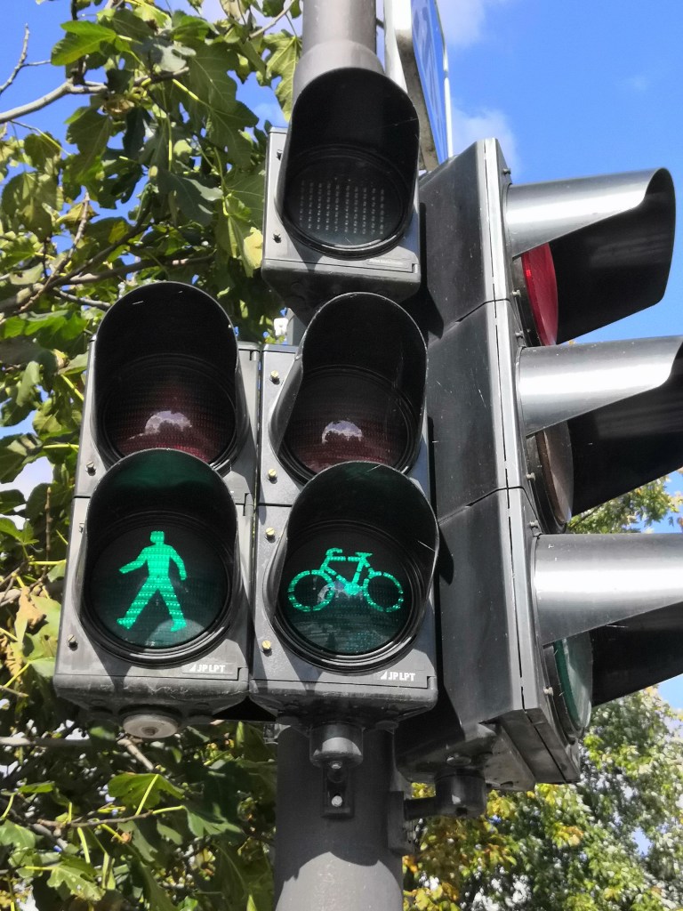 Almost all traffic lights have a green bike, alongside the green man, and bike travel has been properly integrated alongside pedestrian and car travel.