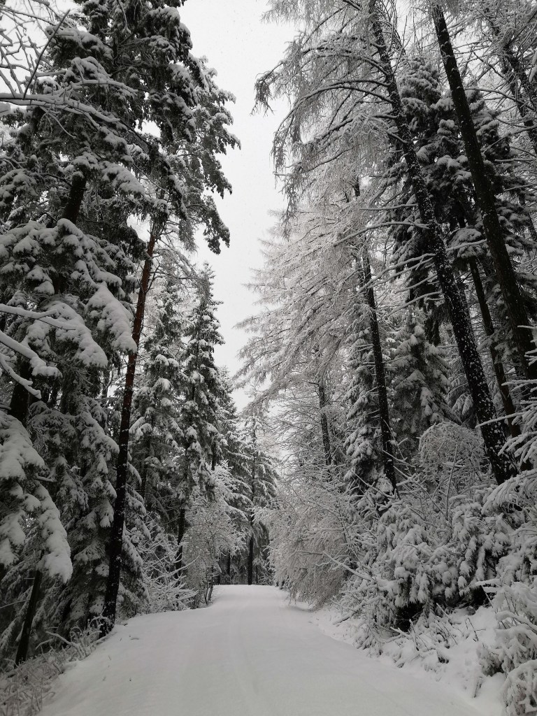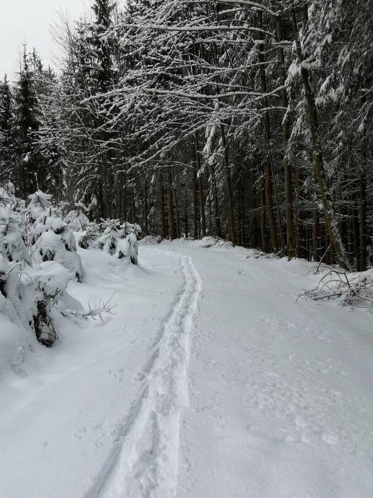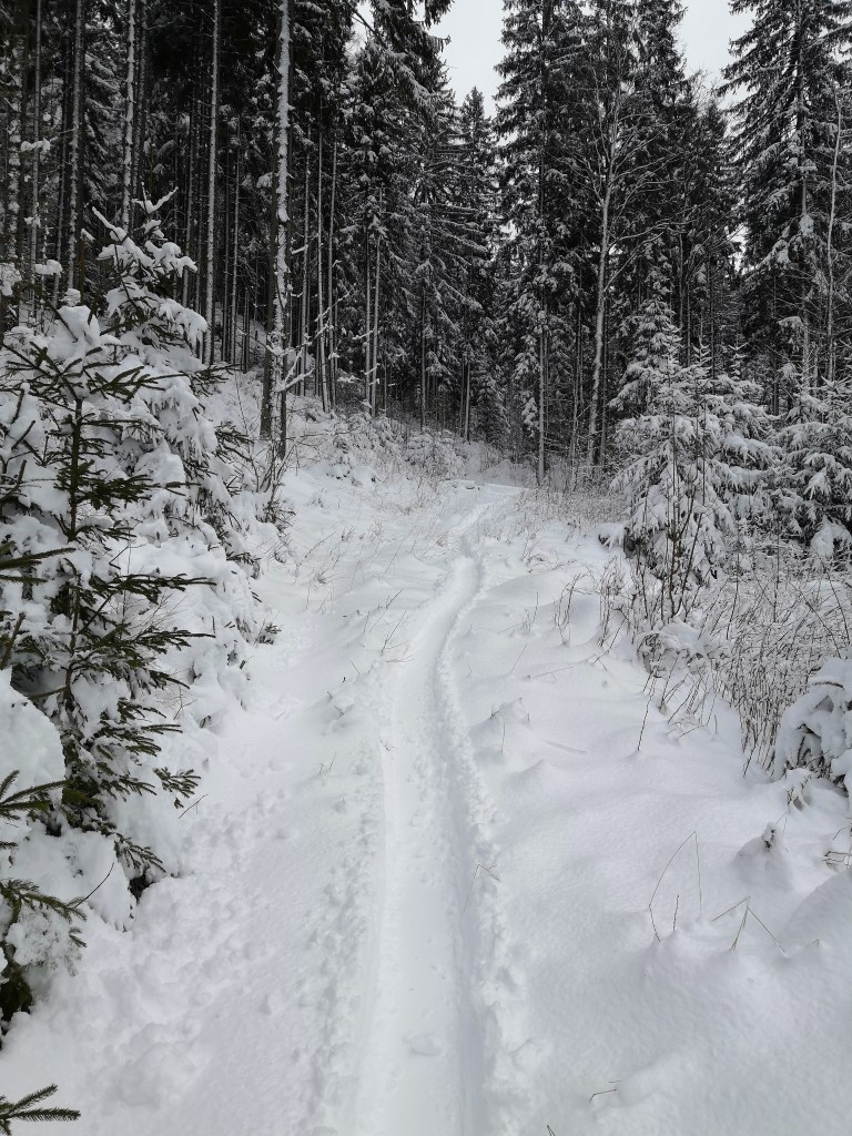 My plan was to use the forestry track to ascend, and then to descend via the clearing under a powerline, which is steep enough and long enough for a decent run. However, when I got to the top of my desired piste, I found there was not quite enough snow to cover the tree trunks and brush. So I had to modify my route and take a narrow footpath down instead. The snow was deep enough – but there wasn’t much room to manoeuvre so little in the way of turns.