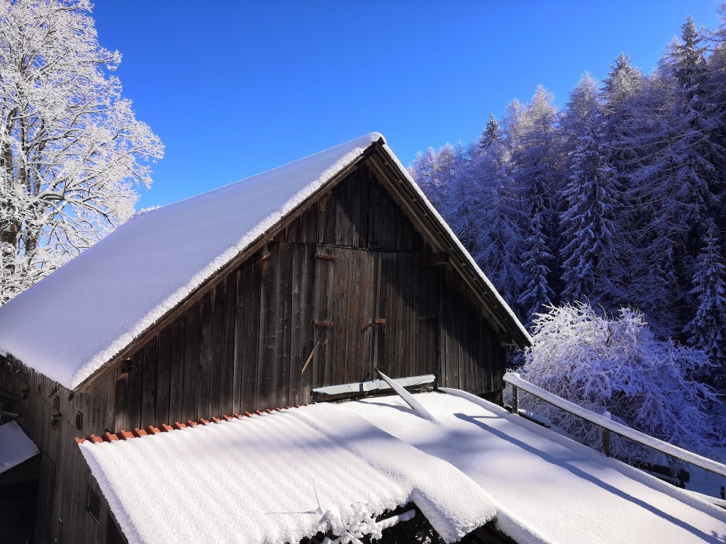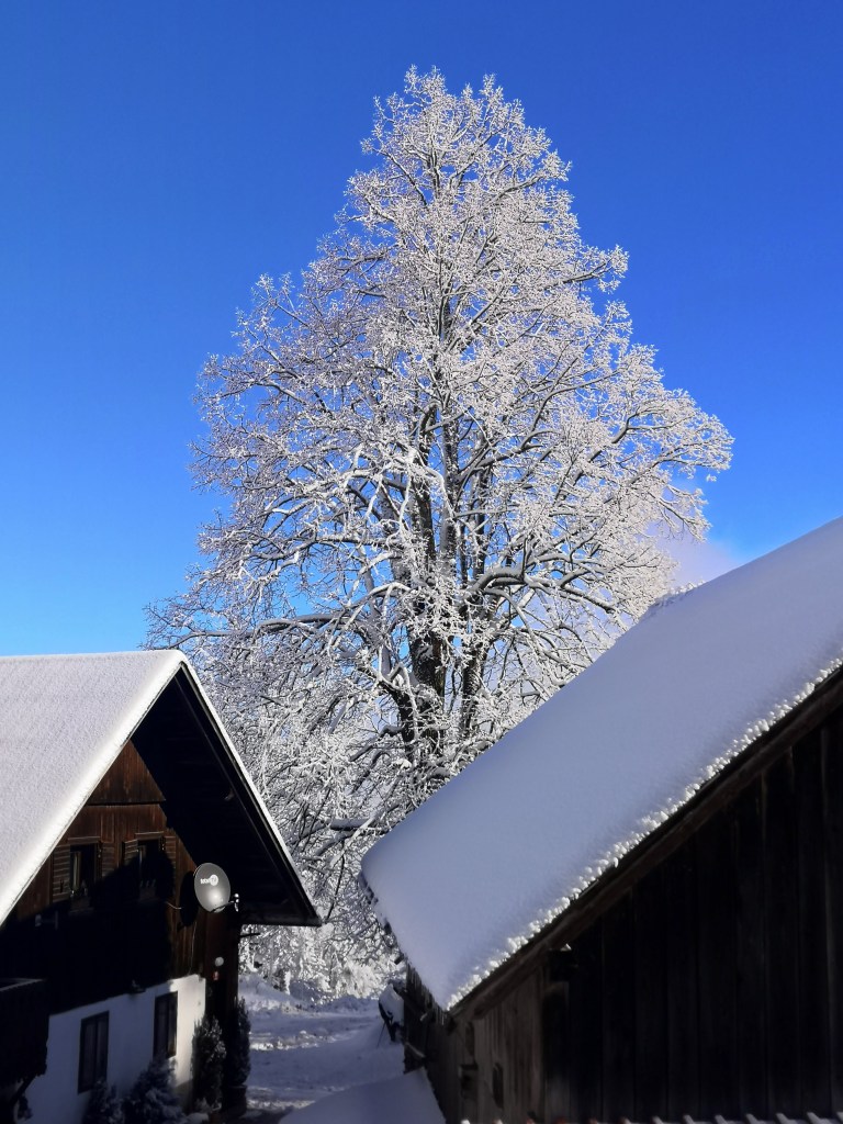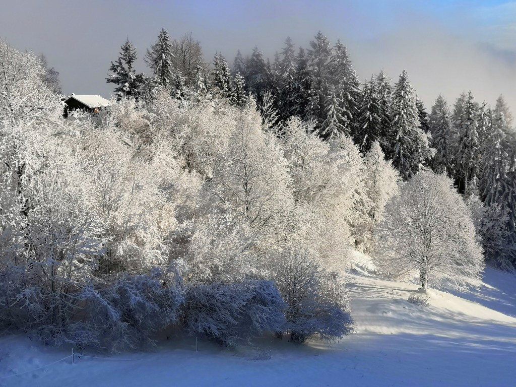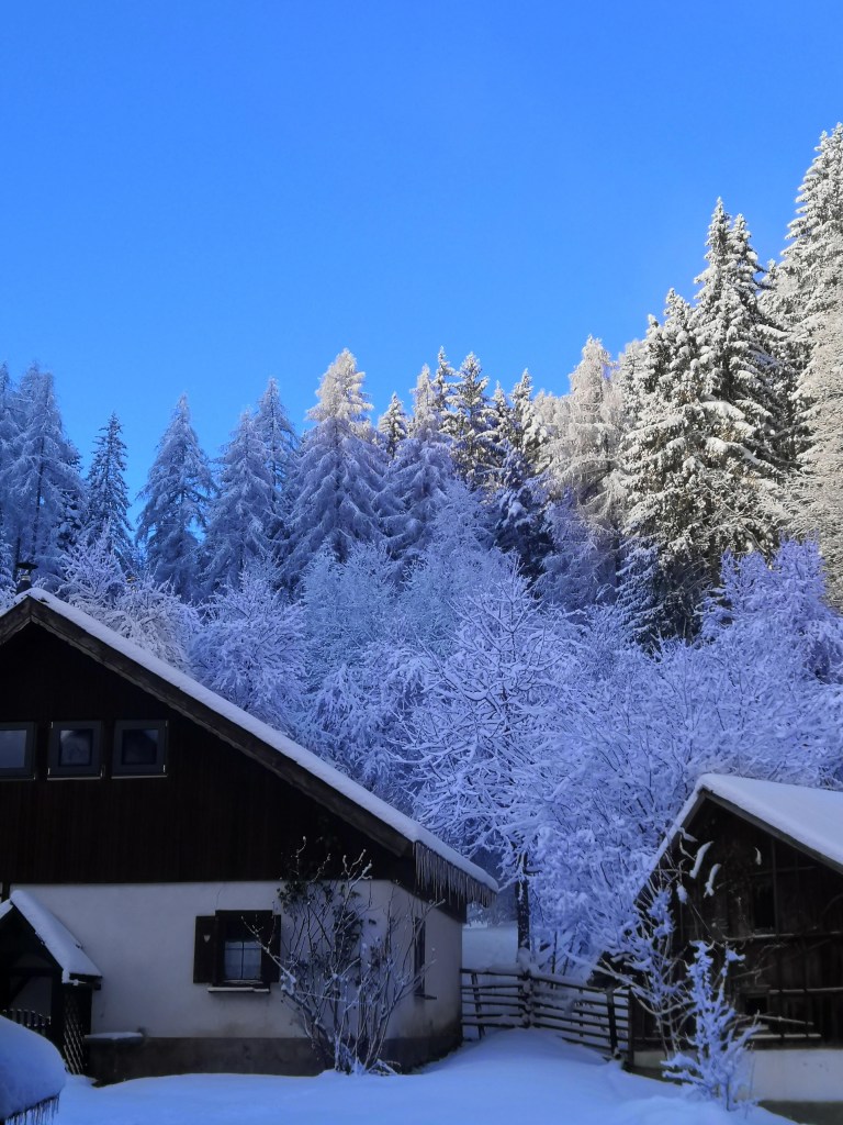 It was however, worth it. The following morning, I was up early and so was the sun. With blue skies above, and trees laden with dollops of fresh snow, the scenery was beautiful, and I wandered around Breg capturing the glorious scene.