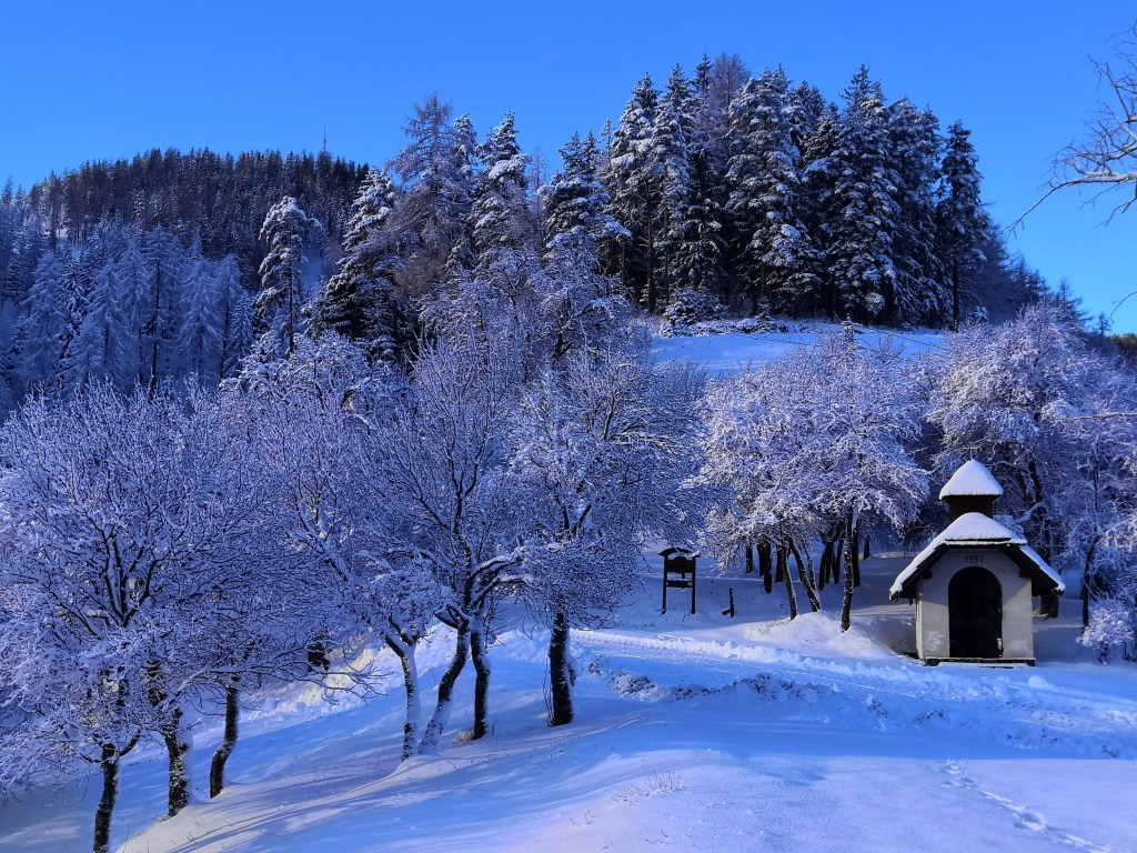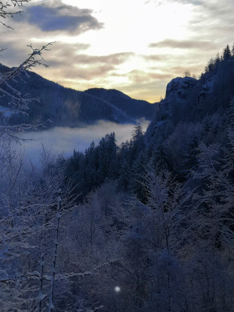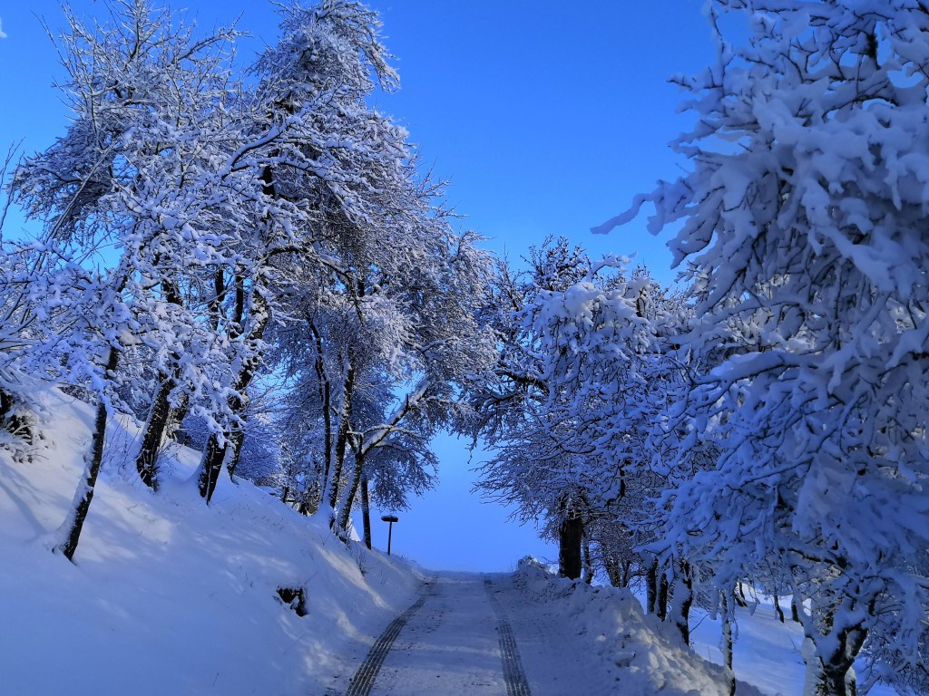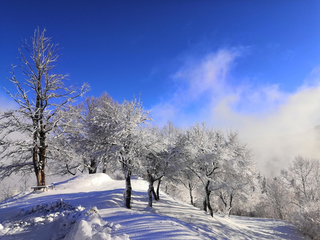 It was however, worth it. The following morning, I was up early and so was the sun. With blue skies above, and trees laden with dollops of fresh snow, the scenery was beautiful, and I wandered around Breg capturing the glorious scene.