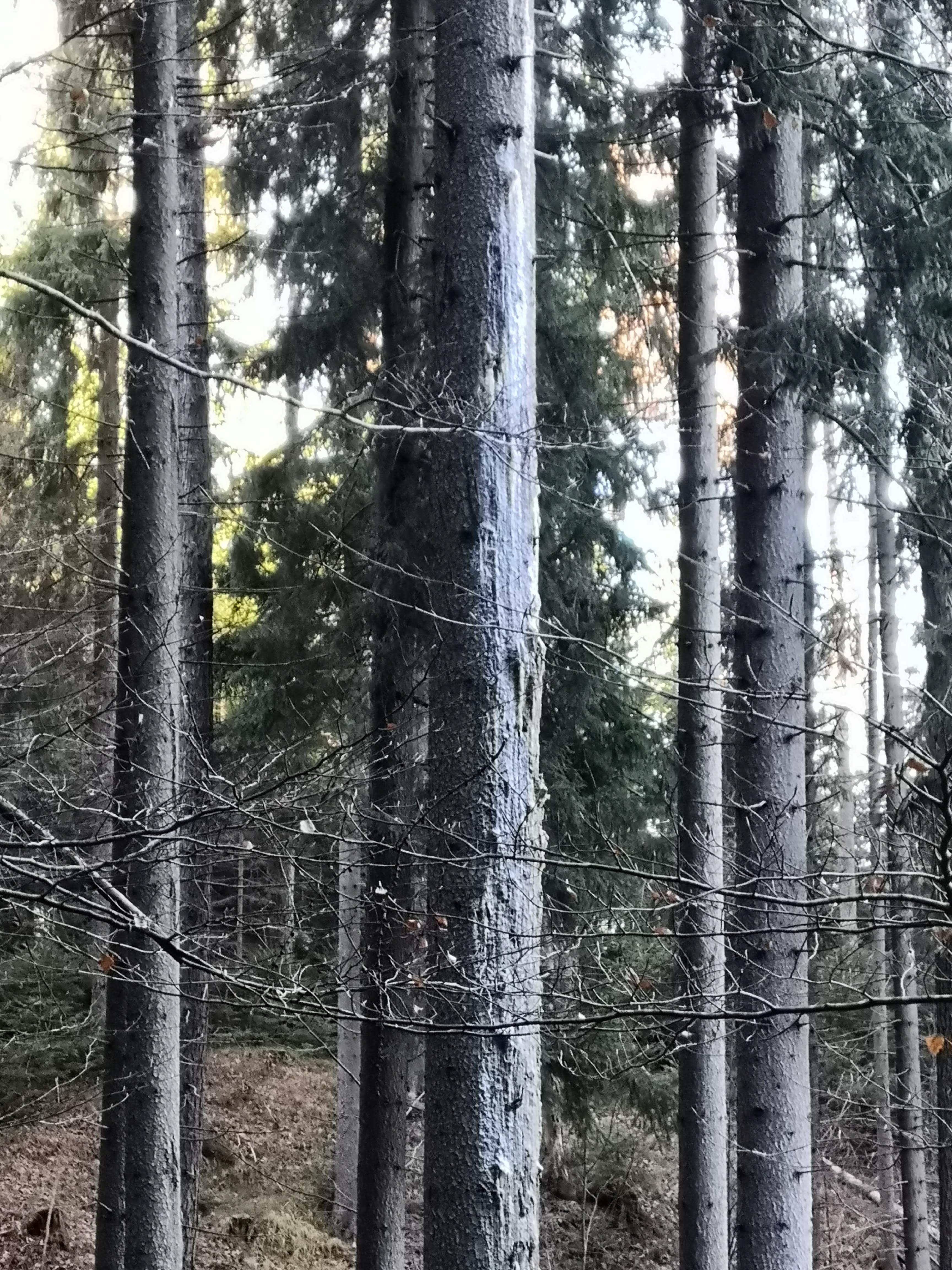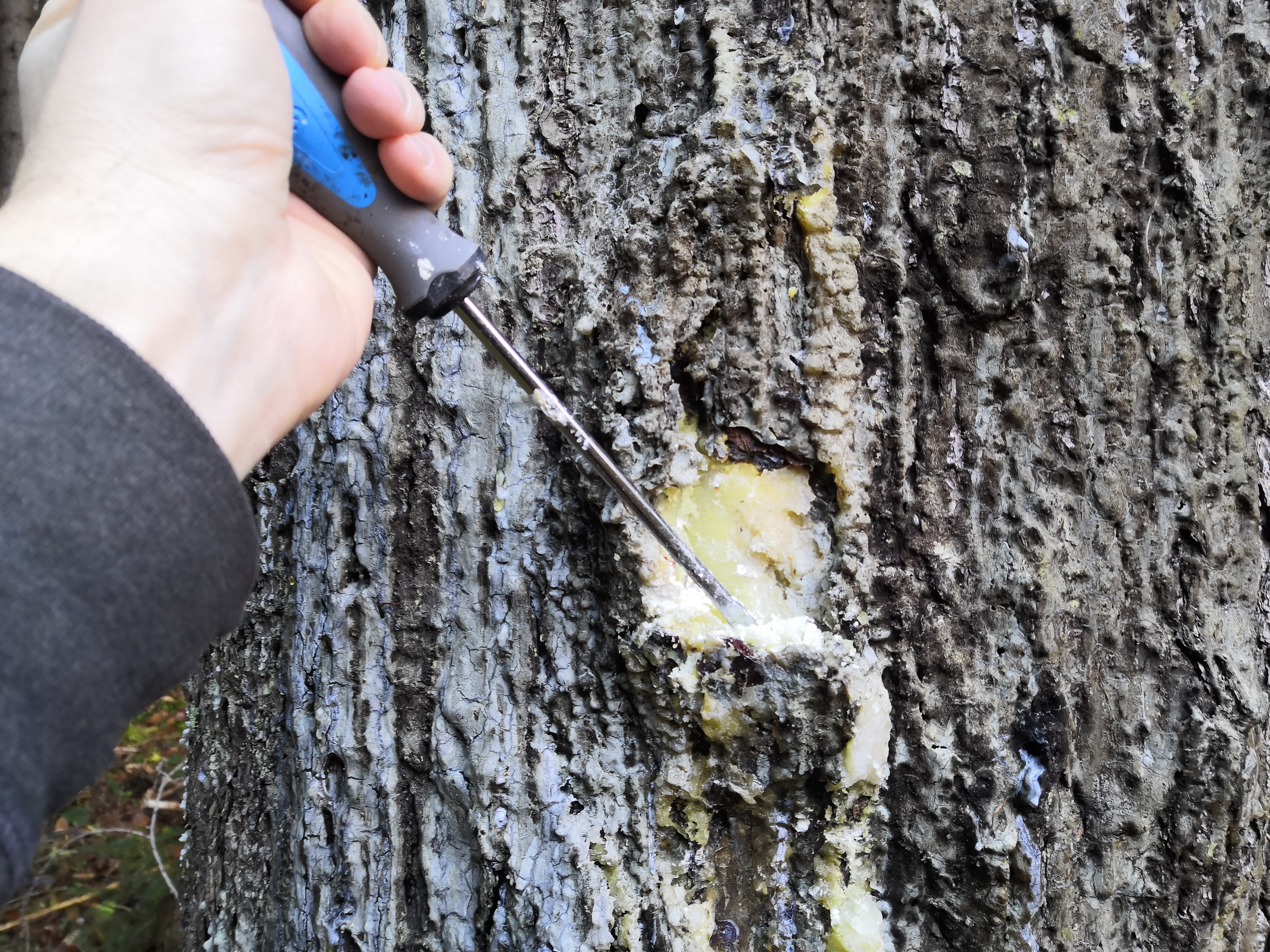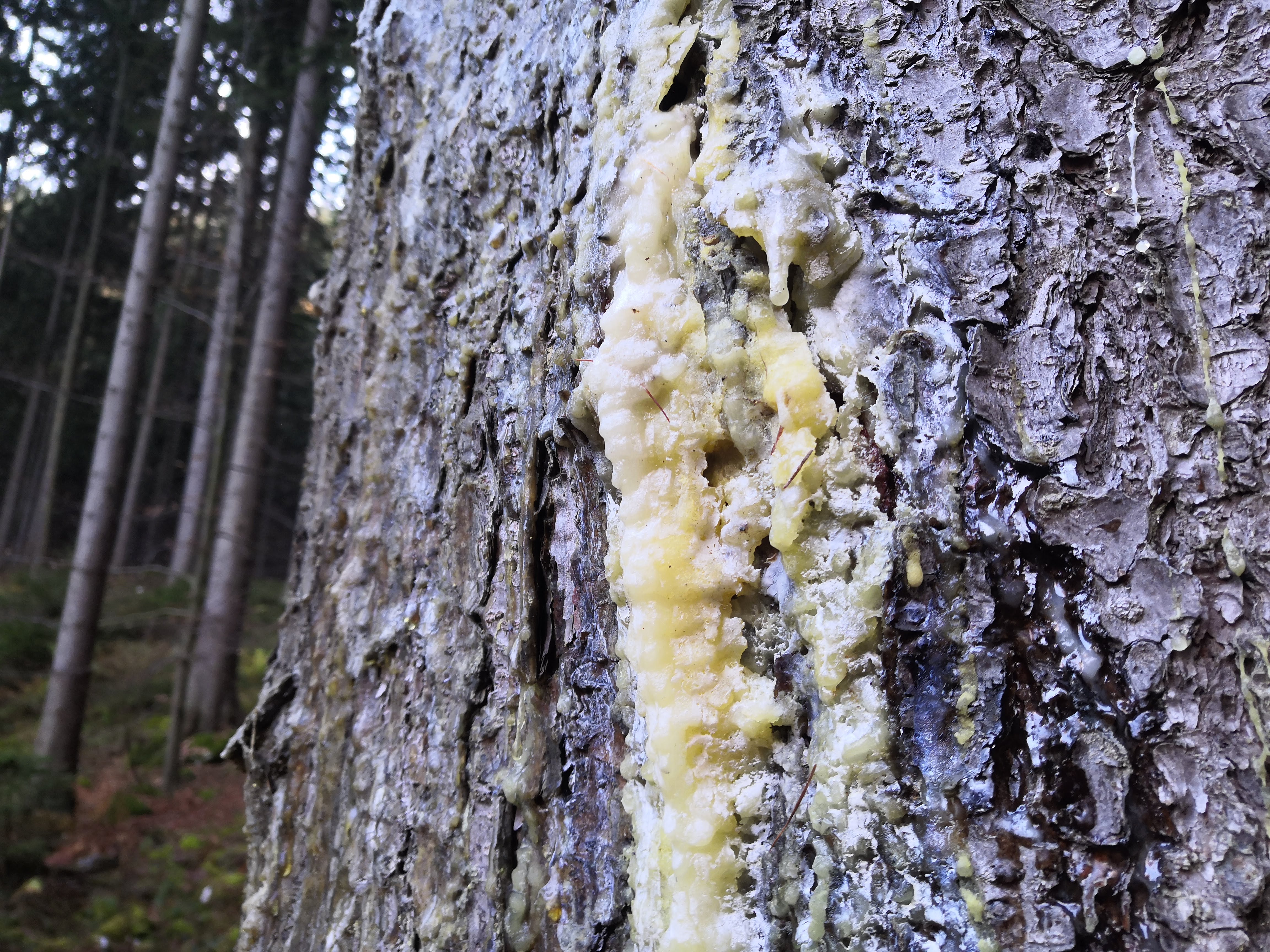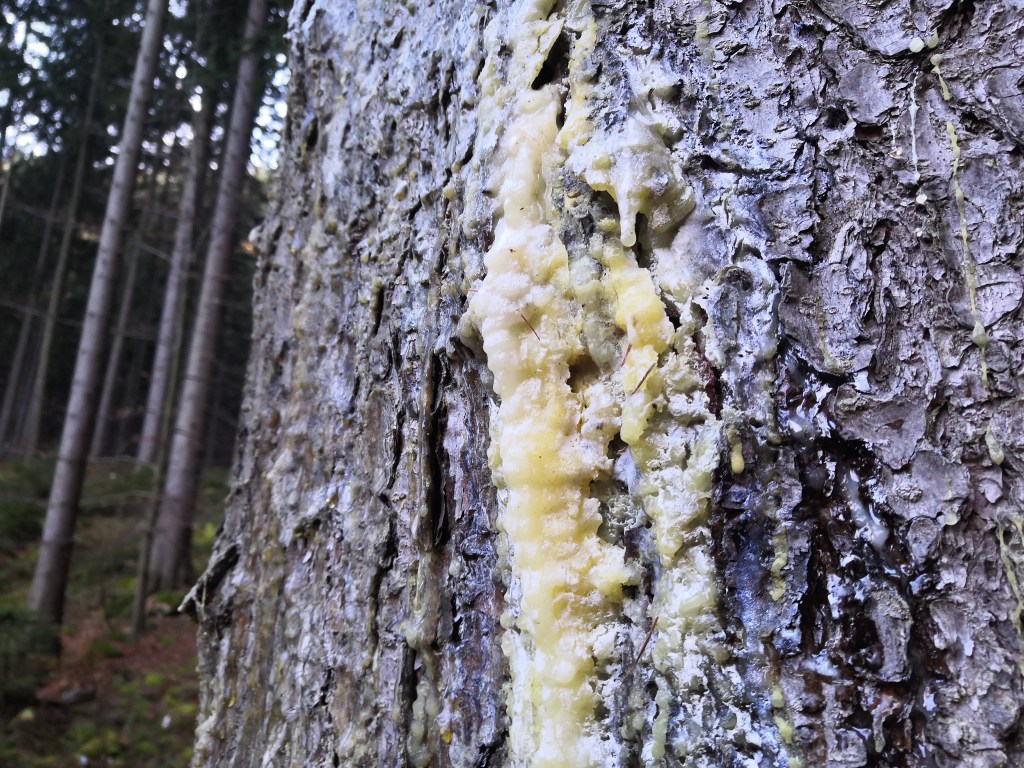 I wandered into the forest to see if I could find and collect some of this amber. There was no need to make any fresh cuts; almost every pine I passed had a least some secretion of resin, but I was looking for trees which had bled so much that the once-liquid resin had solidified into a hard, brittle material – akin to the hardened blood of a scab.