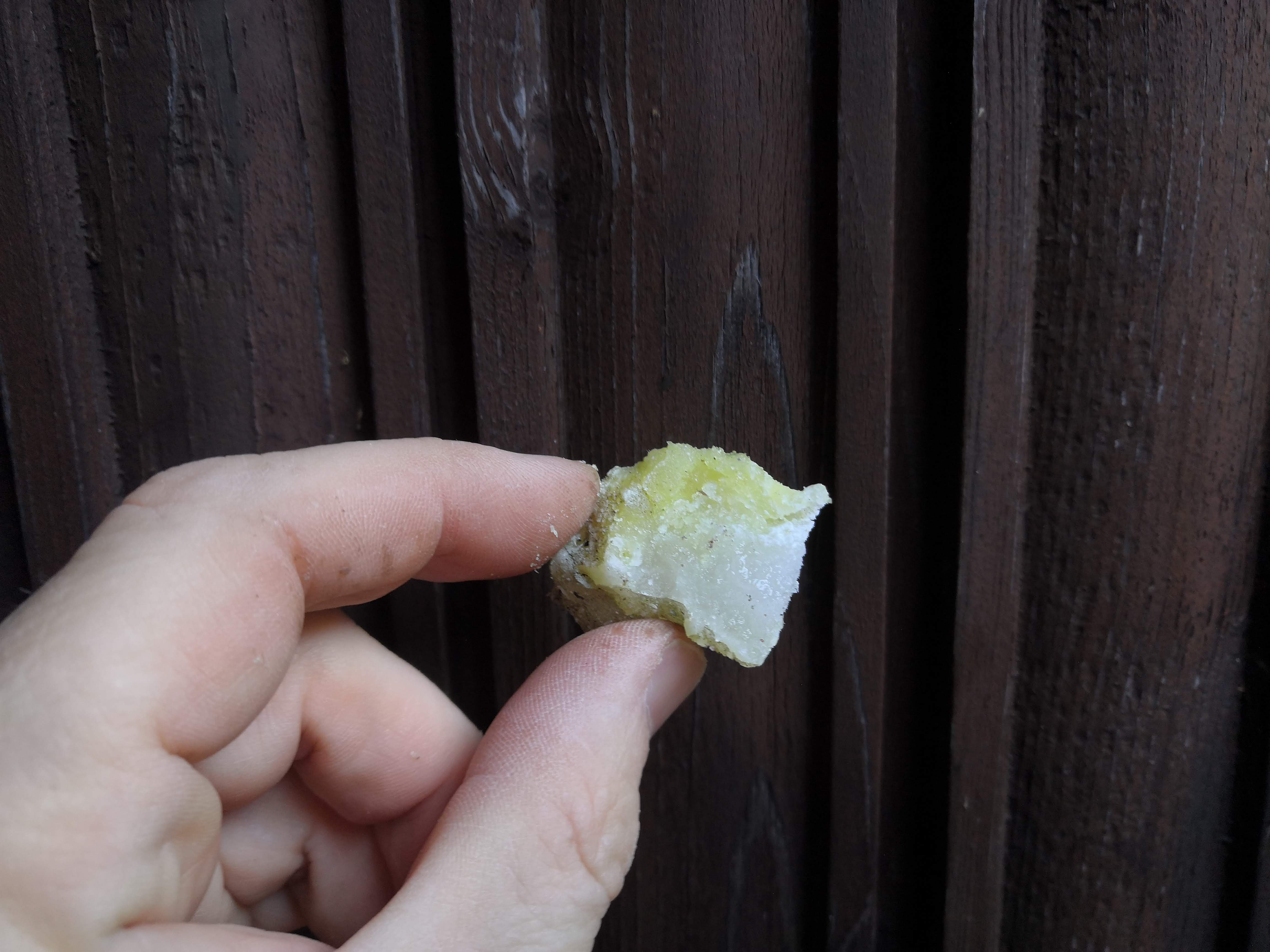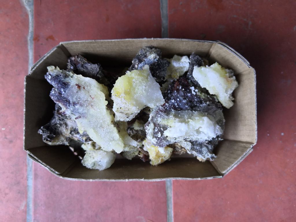 A word of warning for anyone thinking of collecting their own; pine resin is very sticky stuff. Even the hardened chunks tend to have a little viscous goo adhered to their surface so my screwdriver and my hands got a little sticky. But with a couple of drops of hand sanitiser (any strong alcohol will do the trick) it was quickly cleaned off.